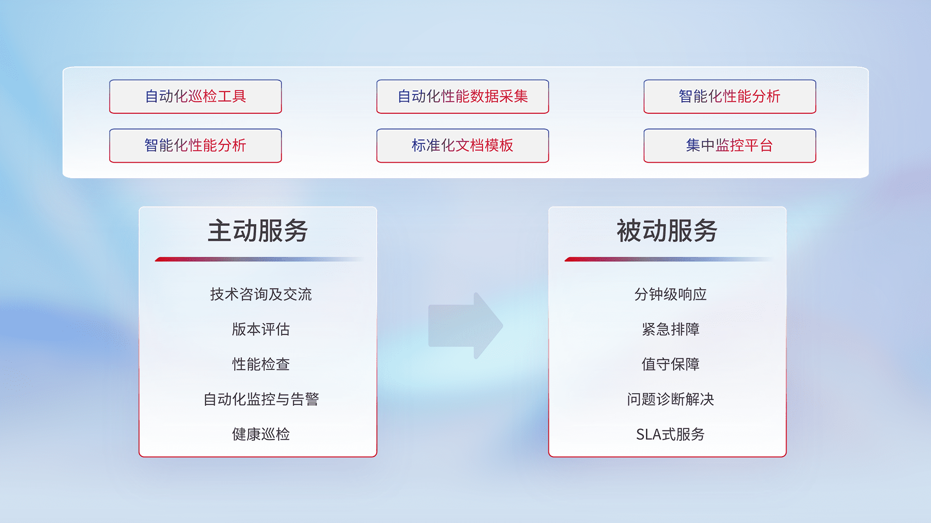 智能化工具和标准化文档,,,保障服务质量,,,,提供主动服务(包含技术咨询、、、、版本评估、、性能检查、、自动化监控与告警、、、、健康巡检)和被动服务包含(分钟级响应、、、紧急排障、、、、值守保障、、、问题诊断解决、、、、SLA服务)。。。